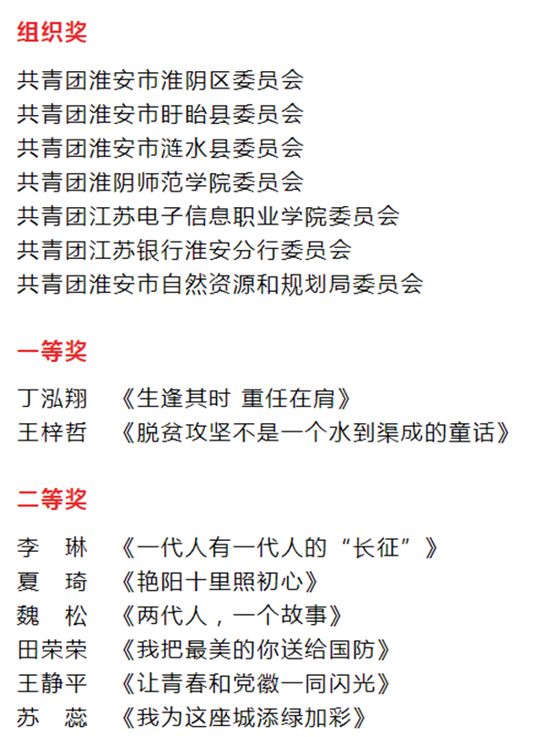 活动中,还对优秀获奖作品代表《艳阳十里照初心》《一代人有一代人的“长征”》《生逢其时 重任在肩》《脱贫攻坚不是一个水到渠成的童话》进行了现场诵读,展现出新时代淮安青年坚定不移听党话、跟党走的决心和不懈奋斗、勇于担当的精神。