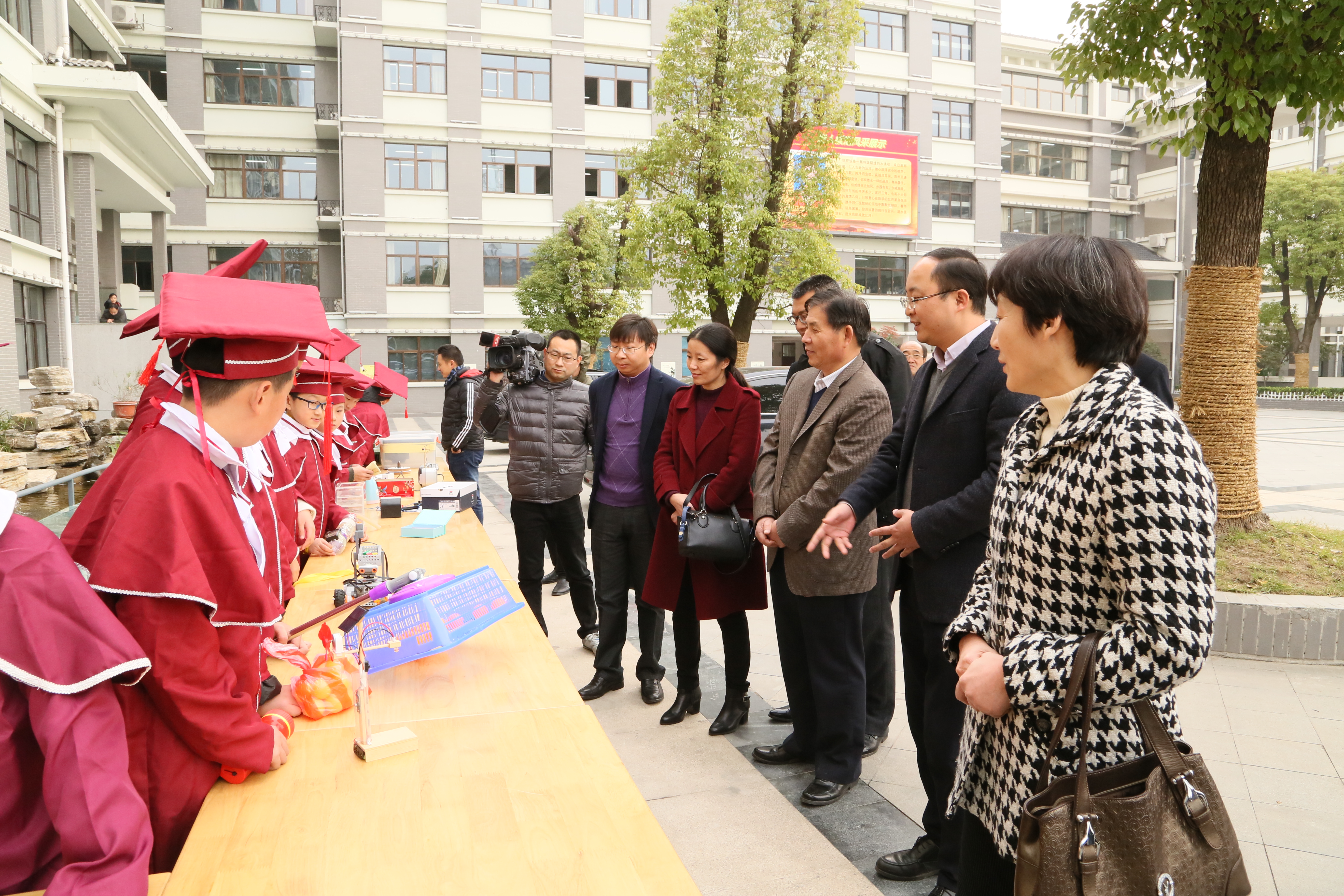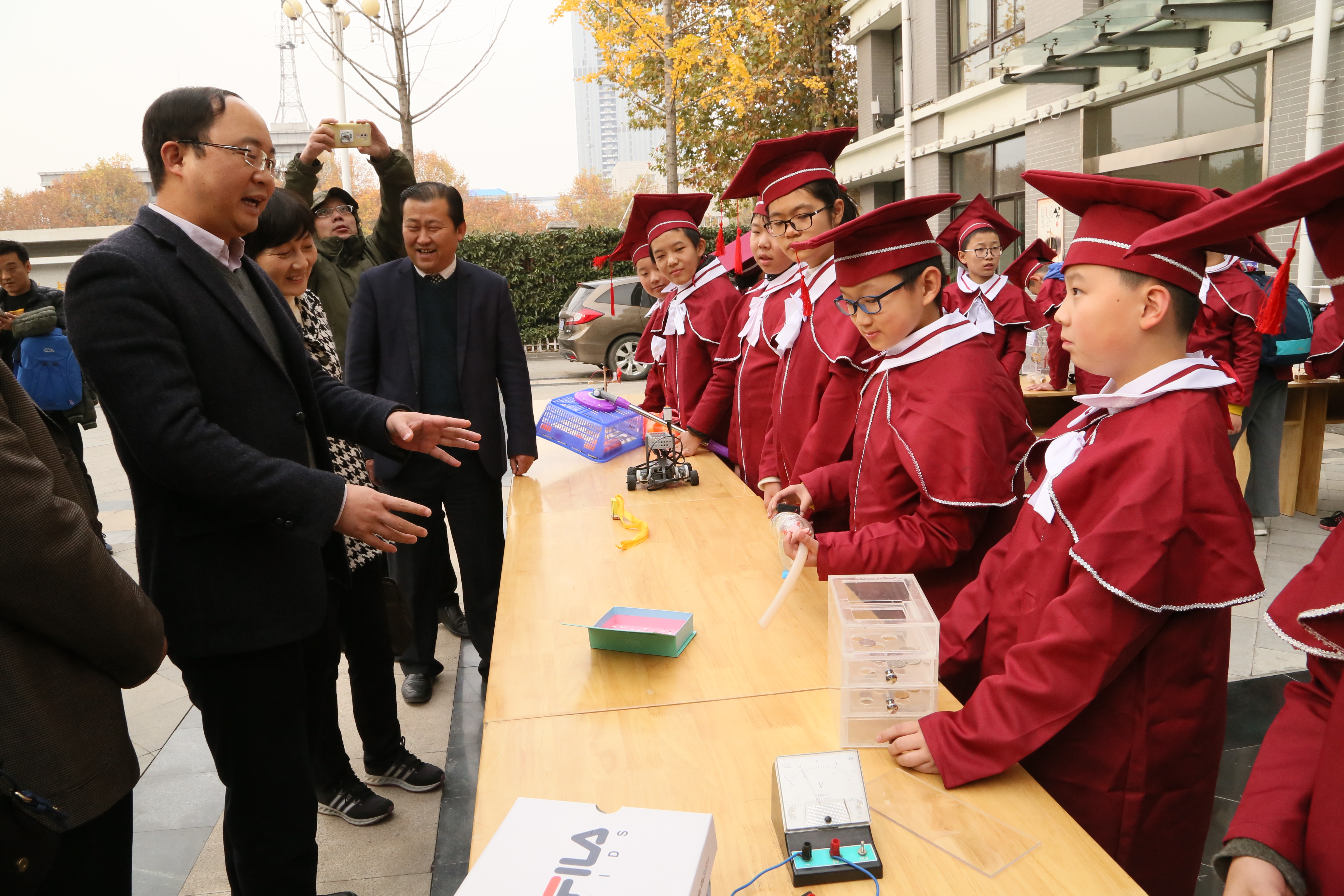 刚进入实验小学校园,十多个"科创小展柜"吸引了大家的注意。30名获奖小院士身着院士服,向嘉宾们介绍自己的科技小发明。一件件小发明制作虽然外表质朴,却蕴含着众多高科技元素,小院士们绘声绘色的介绍、精彩的展示,得到了领导们一致称赞。