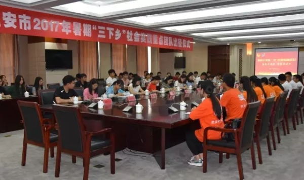 2017年大学生暑期“三下乡”社会实践出征啦!6月29日下午,我市2017年暑期"三下乡"社会实践重点团队出征仪式在市行政中心会议中心举行,团市委学校部、志工部,市水利局,市学联等有关同志,以及来自全市8所大中专院校的40支重点团队骨干成员,市"小青淮"、"河小青"暑期实践活动的学生代表和指导老师参加出征仪式。