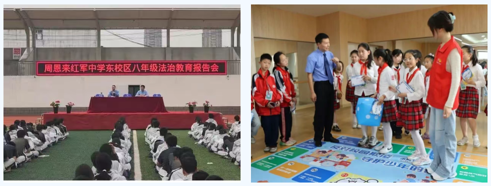 5月14日,团淮安区委联合区检察院、周恩来红军中学举办法治教育报告会。未成年人检察部主任张士海结合近三年未成年人犯罪低龄化数据与盗窃、校园欺凌等案例,警示法律红线,解析如何应对校园欺凌,帮助学生明确行为底线、提升自我保护能力。5月27日,团区委联合区检察院走进新安小学河西分校开展“童趣学法零距离 法治心安护未来”主题普法活动。检察官助理杜大鹏将法律知识融入趣味游戏,激发同学们的学习兴趣,以寓教于乐的方式让法律知识深入人心,提升青少年法律意识。