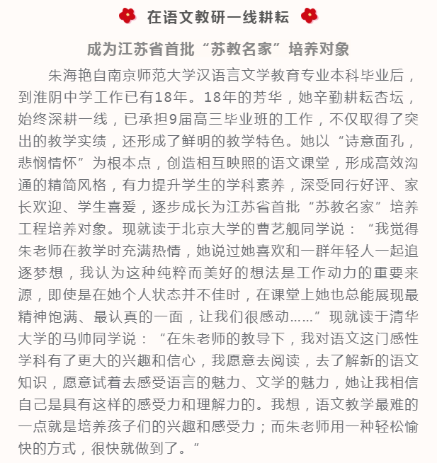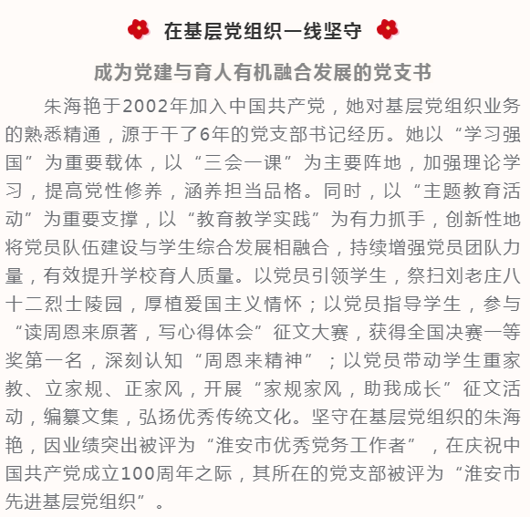 青联榜样说 | 朱海艳:耕耘教育一线,坚守育人初心为深入学习习近平总书记在庆祝中国共产党成立100周年大会上重要讲话精神,引导更广大青年将青春奋斗融入党和人民事业,踊跃投身“一线”激扬青春、挥洒汗水,团市委、市青联特别推出“请党放心 一线有我——青联榜样说”专栏,邀请我市青联委员以“青春奋斗在一线”为主题,讲述自身奋战在改革一线、创新一线、攻坚一线、服务一线的成长奋斗故事,用青年人、身边事影响带动更多青年助力淮安高质量跨越发展开新局。
