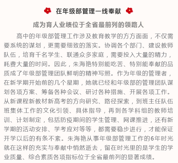 朱海艳饱含青春的激情,始终坚守一线、奉献一线、冲在一线、领跑一线,在平凡的岗位上追求教育的理想、承担育人的责任、挥洒奋斗的汗水,她说:“作为一名教育工作者,德行为根本,身教胜千言,心中始终装着教育强国的梦想,脚下坚持走好教书育人的步伐,用灵魂塑造灵魂,以平凡铸就不凡,不负美好青春,不负党的培养。” |