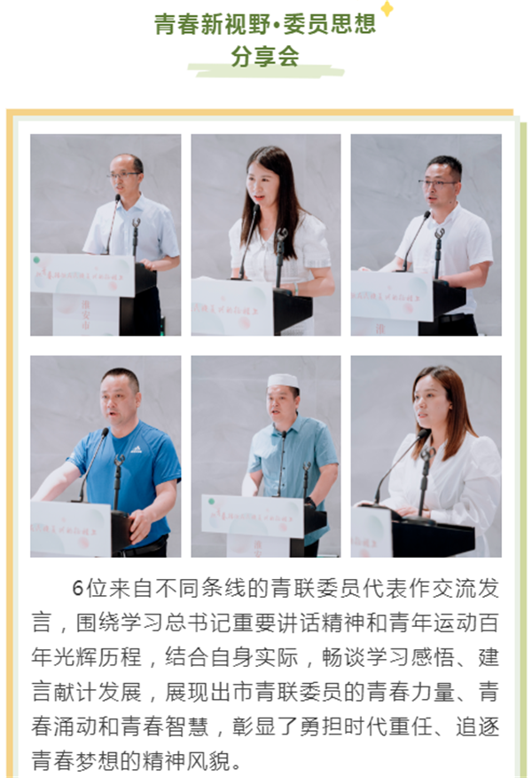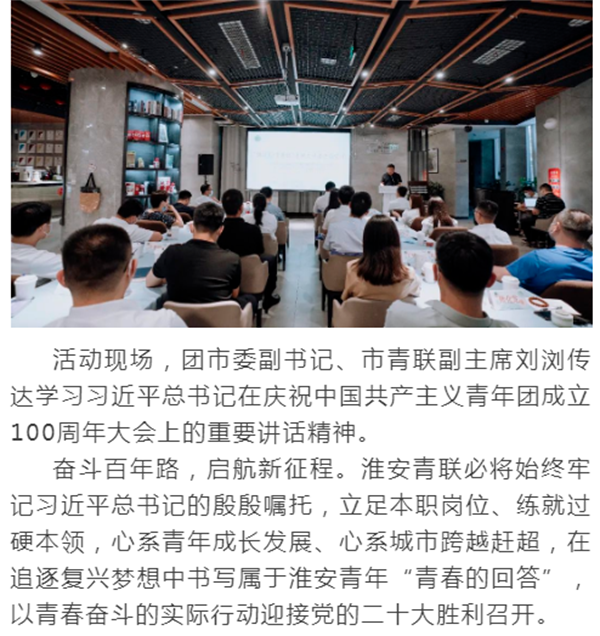 为在全市各级青联组织和青联委员中持续掀起深入学习宣传贯彻习近平总书记在庆祝中国共产主义青年团成立100周年大会上重要讲话精神的热潮, 6月2日下午,市青联在清江浦区泊岸空间举办“把青春播撒在民族复兴的征程上”——淮安市“青联行动周”主题活动,市青联主席团成员、各界别主任及秘书、部分青联委员代表共30余人参加现场活动,另有百余名各级青联委员代表通过腾讯会议线上参与本次活动。 团市委书记、市青联主席何喆出席活动并讲话,勉励青联委员要率先成为敢于“担苦、担难、担重、担险”的“先锋分子”,在追逐复兴梦想的青春赛道上奋力奔跑。要赓续红色基因、聚理想信念之焦,不断筑牢全市各族各界青年团结奋斗的共同思想根基;要播种金色未来、增成长奋进之能,勤学善思、勇于实践,练好人生和事业的基本功;要点燃青色引擎、添跨越发展之力,广泛参与“双招双引”、民生改善、百里画廊建设等经济社会发展火热实践;要涵养本色状态、开时代风气之先,紧紧对照“四个始终成为”的希望和要求深入推进从严治会,弘扬清风正气、展示良好形象。